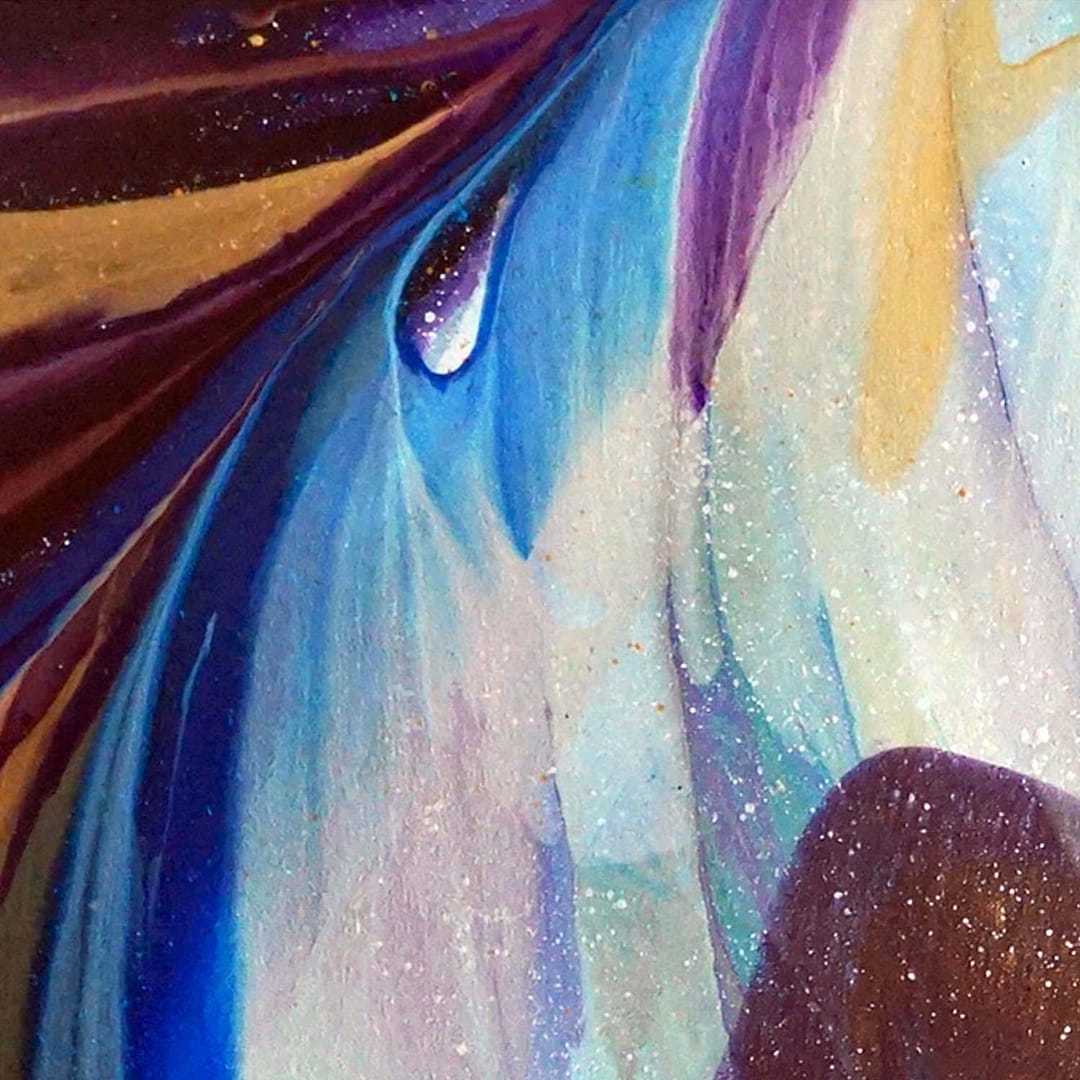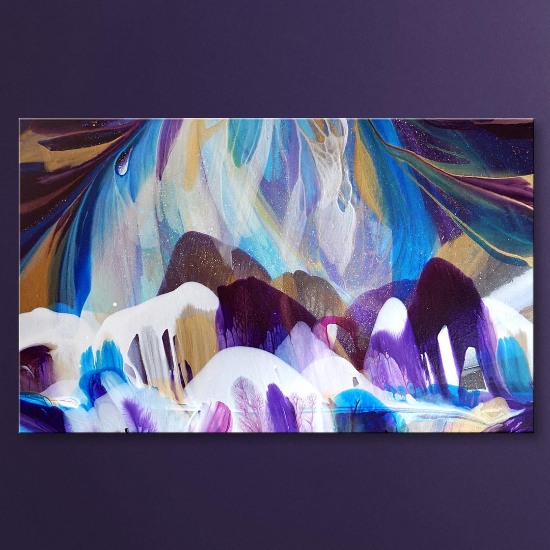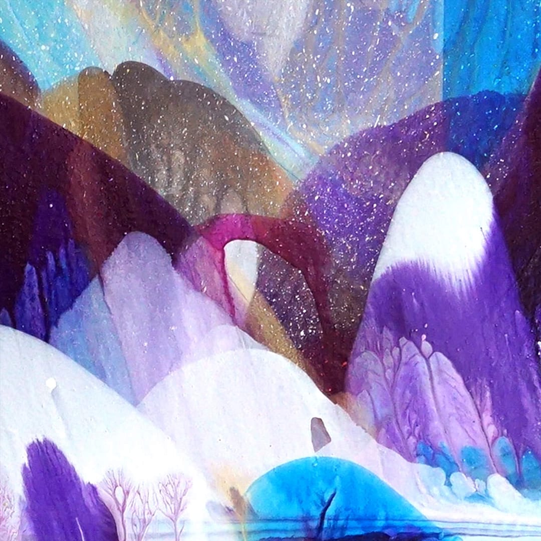 Can you hear the music? Is it singing to you? This art sings to me. The transparent skies with the Aurora Borealis and various layers and shapes cradle the horizon and add light and music in my mind. This is a beautiful evening with people I love and cherish… a winter night with twinkling stars… a glacier in the summer… Along with various colours I also use an iridescent white, bronze and gold paint to tame the piece.